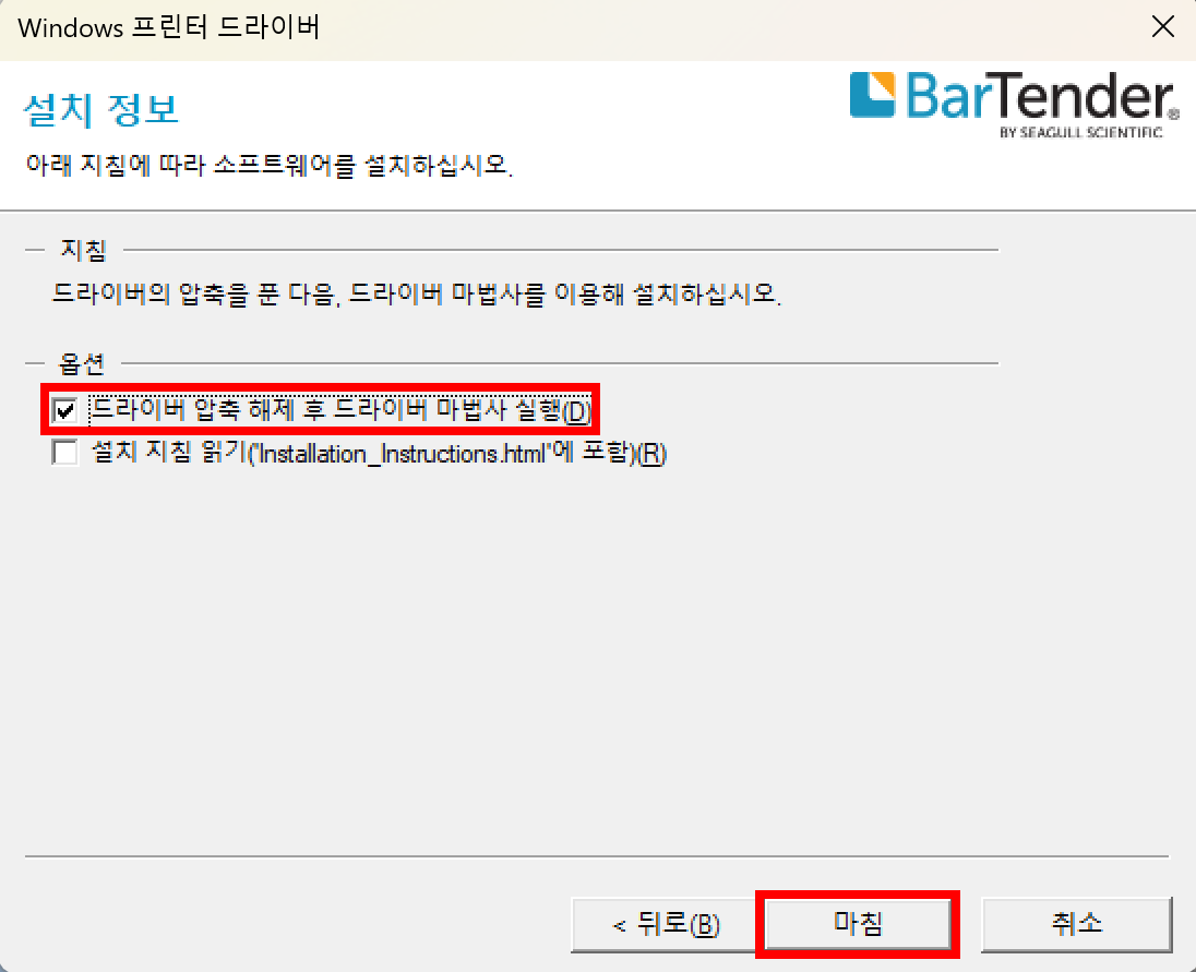 7. 드라이버 설치 프로세스를 시작하려면 마침 클릭!!